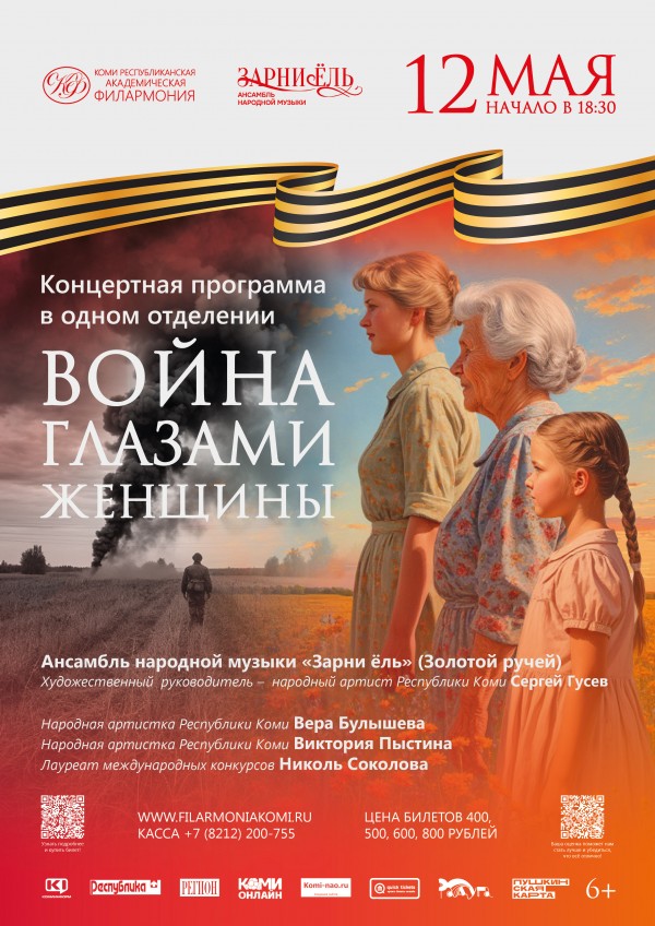 Новая концертная программа с элементами театрализации Ансамбля народной музыки "Зарни ёль" ("Золотой ручей") - это рассказ о стойкости, любви и надежде, которые помогли нашим матерям, сестрам и женам пройти через самые тяжелые испытания Великой Отечественной войны. В концерте прозвучат произведения, посвящённые женским образам военной поры: песни, стихотворения и музыкальные композиции, передающие всю глубину эмоций, которые переживали женщины в годы войны. Зрители попадут в атмосферу тех лет, почувствуют боль разлуки, радость встреч и силу духа, которая помогла выжить и победить. Каждое музыкальное произведение – это история женщин, кто провожал своих любимых на фронт, ждал писем, терял близких, но продолжал верить в Победу.