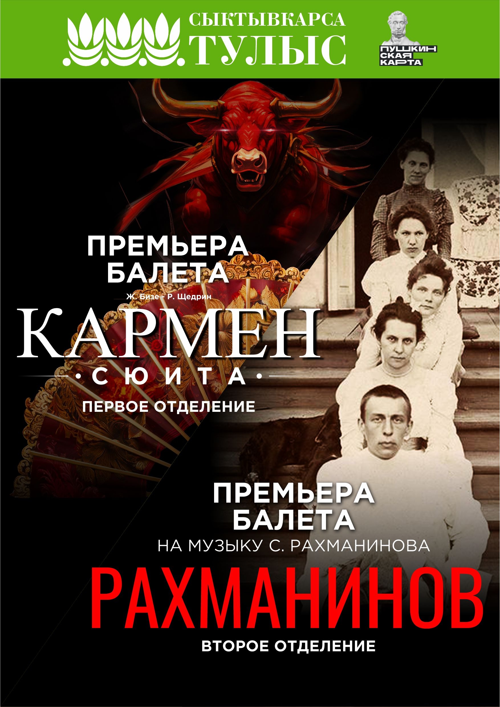 В первом отделении вечера: премьера страстной и темпераментной "Кармен-сюиты" Ж. Бизе – Р. Щедрина. Либретто, хореография и постановка народного артиста СССР, народного артиста Беларуси, лауреата Государственной премии Республики Беларусь, лауреата Международной балетной премии "Бенуа де ла данс", хореографа, известного во всем мире, Валентина Елизарьева. Дирижер-постановщик – художественный руководитель Академического театра оперы и балета Республики Коми Юрий Демидович.